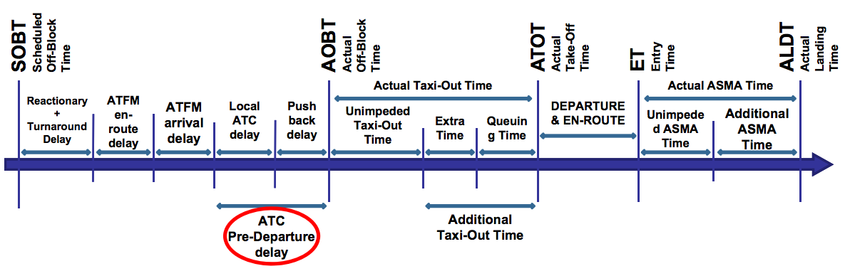 ATC pre-departure delay is the additional time that the aircraft is held at the stand to avoid queuing at the departure runway.