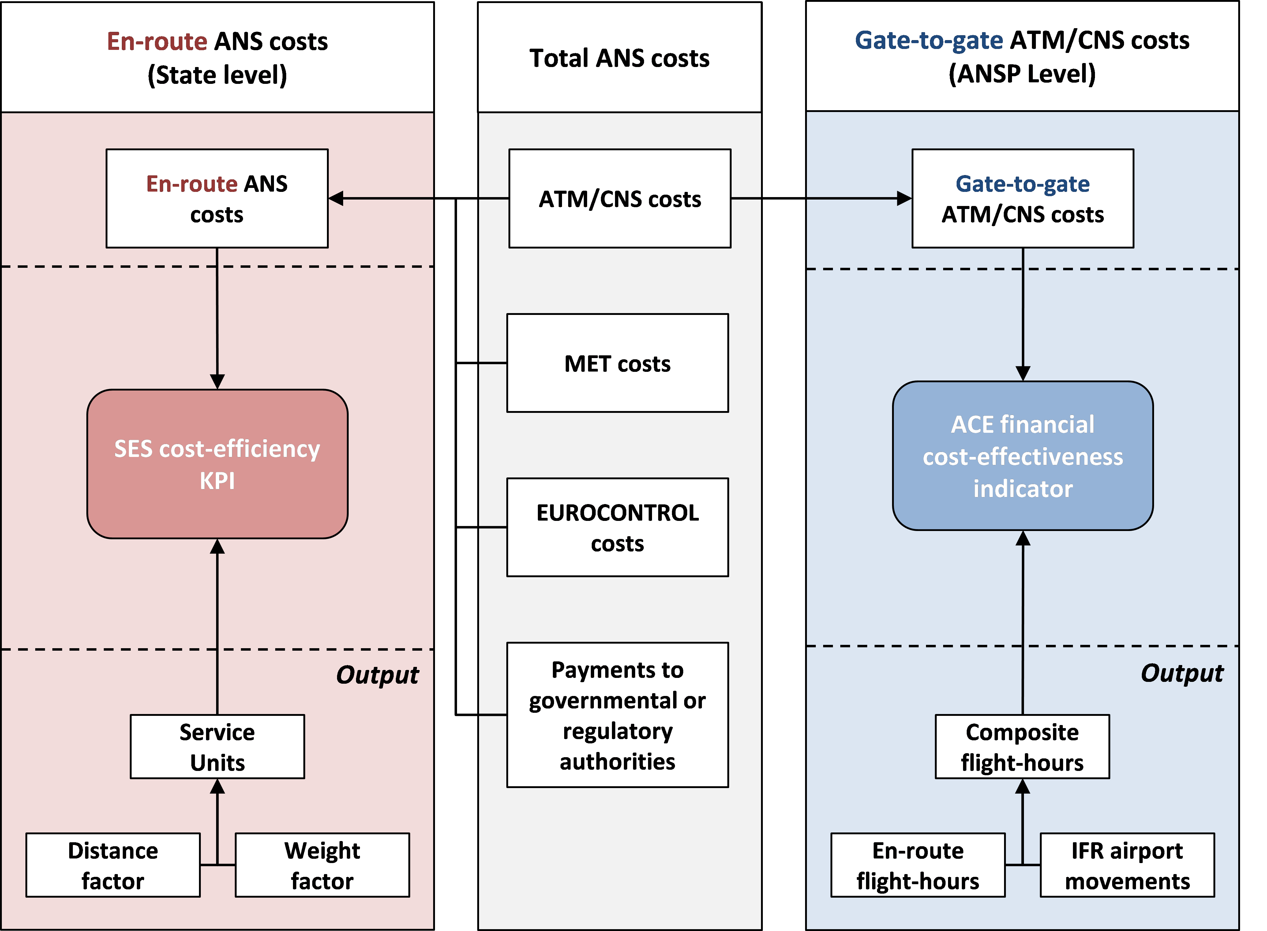 Service scope: Total ANS costs (including costs relating to the ANSPs, METSPs, EUROCONTROL, and NSAs) are used to compute the SES cost-efficiency KPI, while only the ANSPs ATM/CNS provision costs are included in the ACE benchmarking analysis.