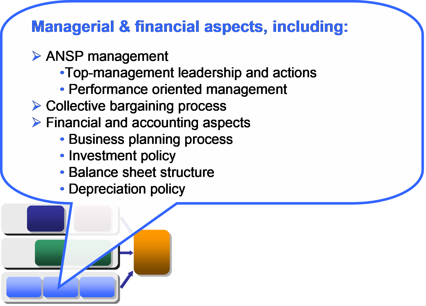 Figure 5.5 lists the factors that would need to be considered in the scope of a comprehensive analysis of the impact of ANSP organisation on performance. They mainly relate to four issues which are typically addressed in the Balanced Scorecard methodology.