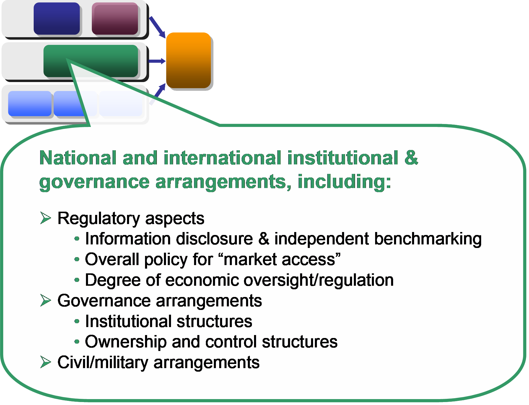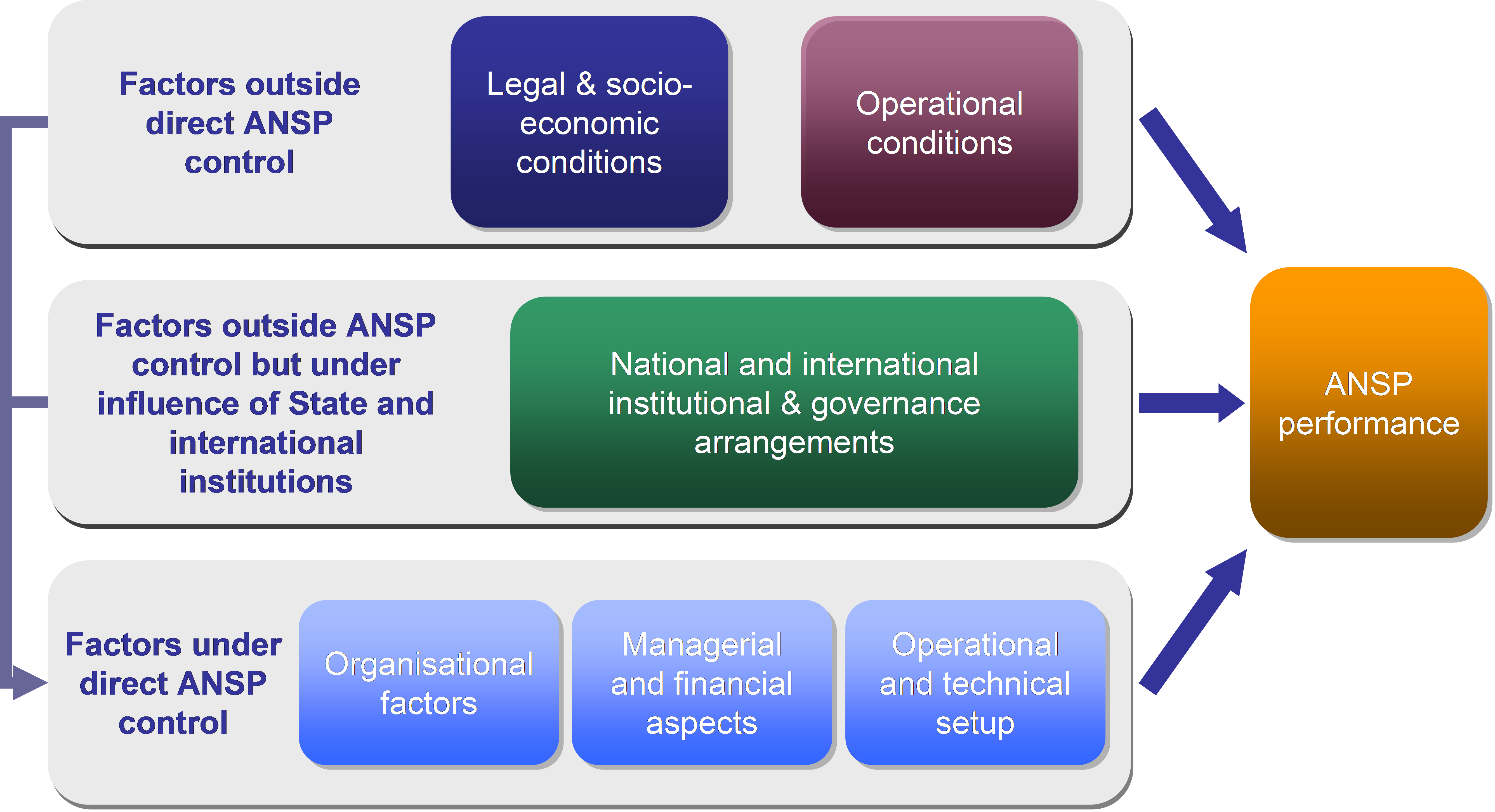 It is generally considered that institutional and governance arrangements will not affect ATM cost-effectiveness directly; rather they act as influences or constraints affecting endogenous factors (such as the overall business objectives, the internal organisation, and the operational setup between civil and military).