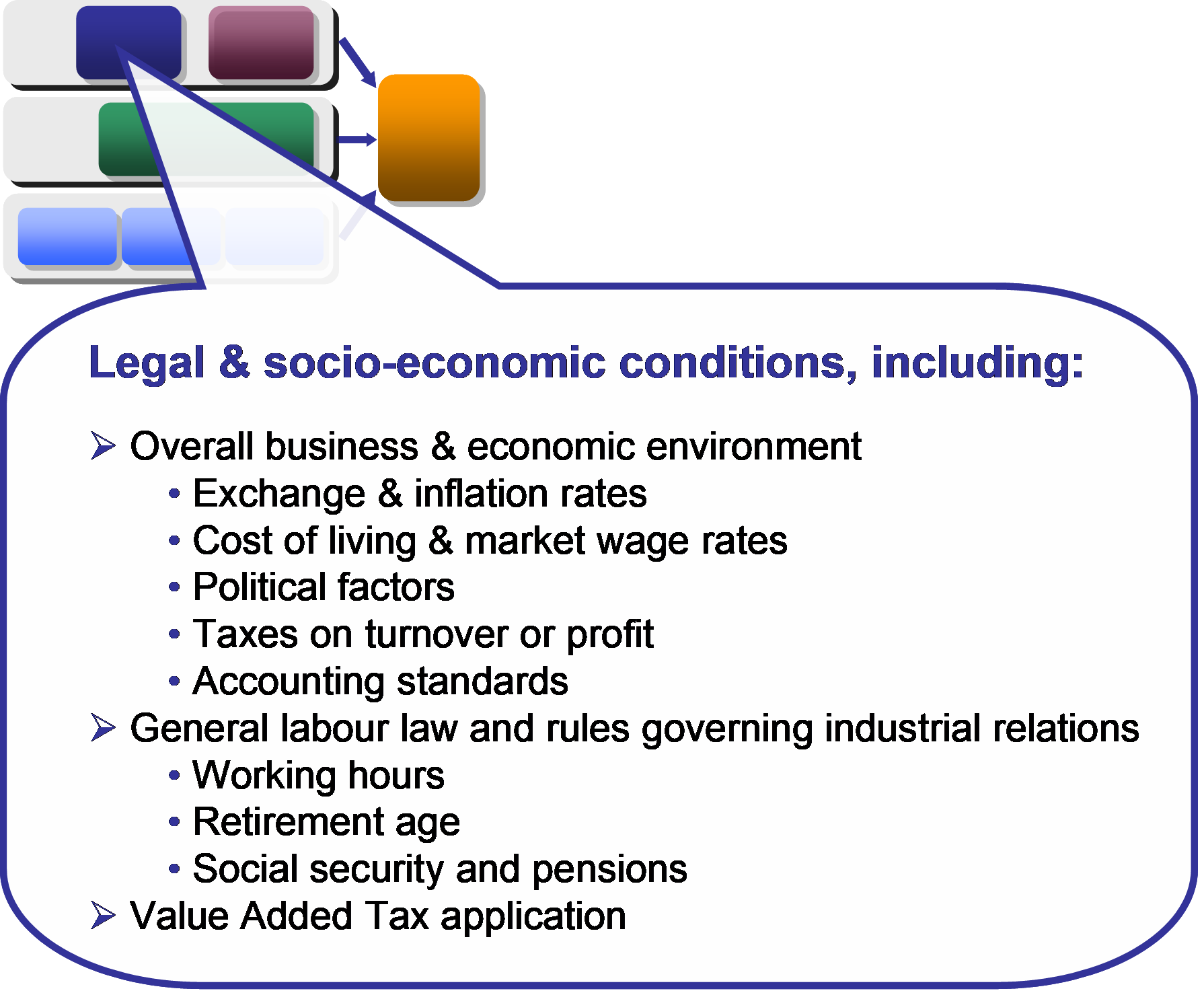 The legal and socio-economic conditions prevailing in individual countries are affected by national policy-makers at a more general level (for example taxation policy), or by national and international macro-economic conditions. Major examples include the prevailing national wage rates, and levels and systems of taxation.