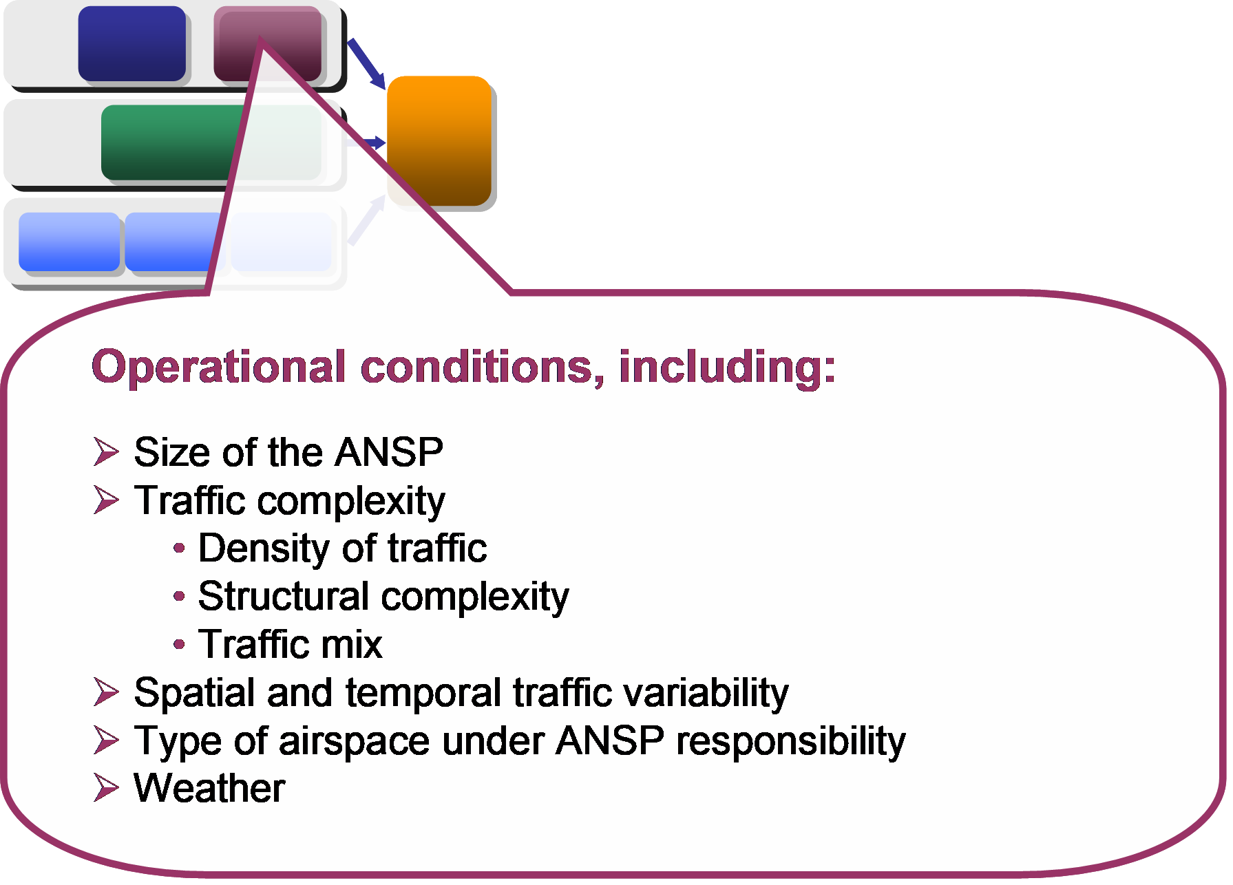 The operational and technical setup of an ANSP is expected to be influenced by both exogenous factors (typically the operational environment) and other endogenous factors (such as internal organisation and investment policy). The operational and technical setup is expected to affect both labour and capital productivity and the level of support costs.