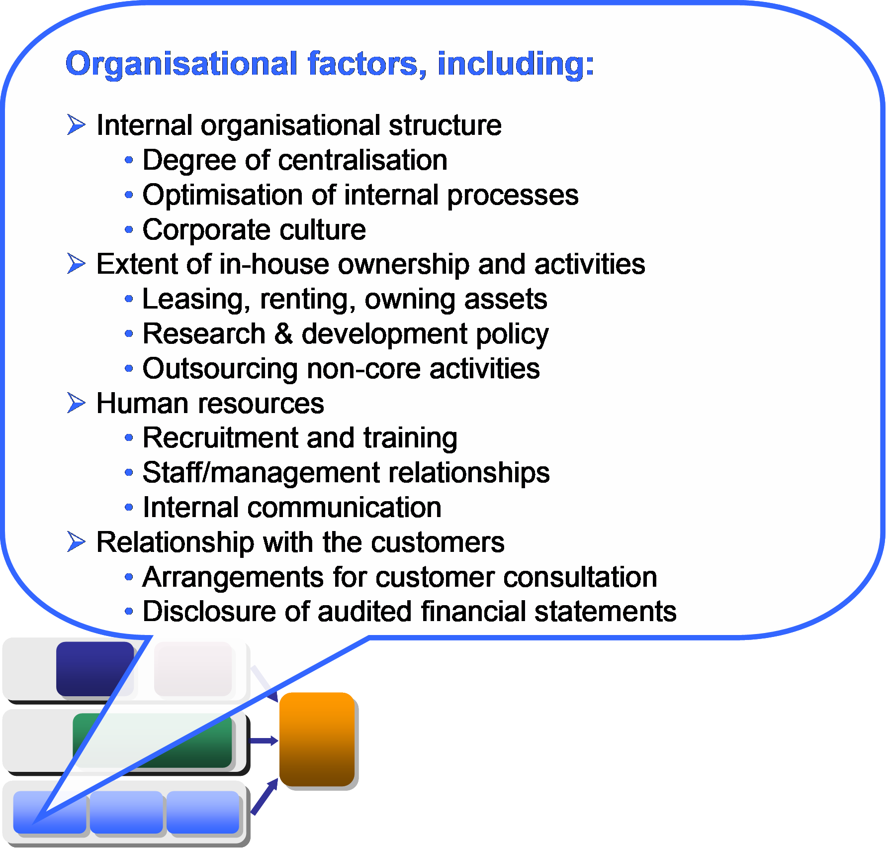 Not all organisational factors will directly affect cost-effectiveness; some enable or facilitate the achievement of performance when they are set in conformity with the business objectives. It is likely that no single model should constitute “best practice” in all circumstances.