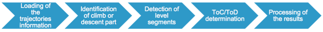 The analysis is performed in 5 major steps. First, the trajectory data has to be loaded into the analysis software. Then the climb or descent part is identified in these trajectories. In these parts of the trajectories the level segments are detected and saved and additional filters are applied. The next step is the determination of the Top of Climb or Top of Descent. Finally, the results are calculated and processed for presentation. This process is visualised in Figure 1.
