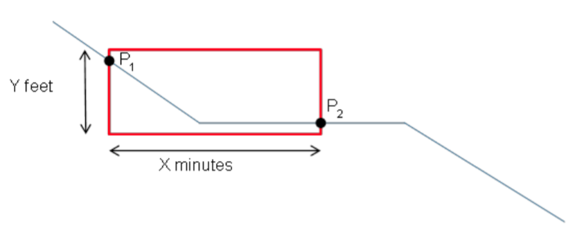 In the climb or descent parts of the trajectories the level segments should be determined. The trajectory part between two points on that trajectory is considered as level when the trajectory stays within a fictional window as can be seen in Figure @ref(fig:vfe-cd-figure-002).